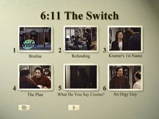 is found in this episode, because it is so hilarious it doesn't need any to help it out. This Top 50 ep is simply hilarious. We get the gayest guy ever, who should be drinking champagne coolies with the wig master or serving on the ship in LSL7. We get George's girlfriend who thinks that he is a shark that kills people in Amity in Orlando. We get huge significant things such as Kramer's first name being Cosmo and seeing Babs for the first time. We get a beautiful LD, What do you say Cosmo? with Kramer answering Everything. We get a beautiful Newman, making out with his best bud's mom and that he is fantastic at tennis, or tinnis as the lady from Doubleday calls it, who loves tinnis so much that she should die without it. All of this, would make this episode extremely hilarious, and possibly worthy of Top 50 status. But what pushes it into the stratosphere, past the Ozone layer, and into the far recesses of outer space, is Jerry and George discussing The Switch. It is simply, yet complexly, one of the funniest scenes throughout the halls of science. Whatever film noir movie it spoofs, as well as its continuation with Babs and Newman, is excellently hilarious. Then Jerry's explanation in his typical hilarious fashion, of why he can't be an orgy guy, is perfectly perfect. Overall, a solidly hilarious funny awesome episode. Adam - Hilarious episode. Would not have made my Top 50 without the lunch scene, but after seeing that, I couldn't even dare to not put it on.