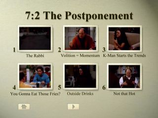 And now to the ep. Everything in this ep is stimply hilarious. From the Rabbi to Rabbi Glickman/Kirschbaum, Volition=Momentum, to K-Man starting the trends. Hilarious stuff with the guy asking his gal while she's crying if she's eating her fries, Kramer and Jerry still talking about Kramer sending Jerry to jail, she cried, you craved, and super continuations, like LD's Season 4 archs, with Kramer's cafe Latte -----> Jackie Chiles, Susan and the marriage, and the stalls. Great stuff with Elaine's super jealousy of George, yet hugs him, and he sticks it to her, Jerry feeding Kramer about 2nd chances, and Elaine's bad ass moment. Beautiful stuff with Jerry's Jackie Mason imitation, classic LD with George not having a good turn (of his neck), Jerry totally ignoring George and saying that he should shoot for March, Kramer drinking Cafe Latte since the 5th grade, link back to Plan 9 From Outer Space in 2:11 The Chinese Restaurant, George with his talking to Jerry, while motioning that he was talking to Jerry to Susan when coming home, missed out on the makeup sex/sodomy, link forward to conjugal visit sex, Well Rabbi, Well, the Usher guessing that it is a Cafe Latte in Kramer's shirt, and Jerry ratting him out, Coffee Boy, and the super Reform Rabbi who wants to set up the shiksa Elaine with his Jewish nephew. Everything is hilarious. Overall, an excellent episode, well deserved of the Top 10, not a clue about how it didn't make the Top 50 last Siyum. Adam - Hilarious episode. I'm ashamed to even say that this wasn't even on my Top 50, let alone my Top 10. For this is one of the greatest episodes in all of Seinfeld lore. Basically that's all I can tell you. Beautiful episode. 112."The Postponement" (September 28, 1995) SUMMARY George gets Susan to postpone the wedding date. Elaine is jealous of George's being