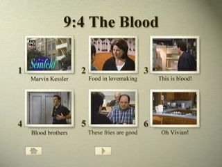 Although I thought it would reach greater heights than the Top 50, alas, I was wrong. However, let's not knock this episode, as it is still hilarious. Just a warning though, that we watched this episode a while ago to say the least. Anyway, hilarious stuff with Marvin Kessler and Kramer knowing he died and how that's such a shock, even though he's 96, George's whole lovemaking fiasco, Vivian with basically anything she says in her whining extending voice, with such greats as "Very knowledgable" and "a few health problems", we look great, Kramer yelling at the blood bank about their service rates going up, 9 1/2 Weeks or Ghosbusters with the pastrami scene, the whole thing with the blood, starting with Jerry thinking it's the Jello and then the tomato juice, and then of course, two of the funniest scenes in all of Seinfeld, Jerry and Kramer screaming, and then at the end of the ep, Jerry, Kramer, and Newman screaming. Then we have Jerry's pulse going "hey buddy", Kramer calling Jerry's parents every week b/c Jerry doesn't, Morty's "PLUM!", Kramer taping Canadian Parliament on C-SPAN, Kramer and Newman watching an instructional video on how to make your own sausages, and making like 200 sausages, all in his bedroom, George's pleasuring you, while fixing the antenna to watch TV, Flew too close to the sun on wings of pastrami, all of George's lies to Vivian, the salted cured meats, and JJ somehow seeing that they're watching Seinfeld on the TV. Overall, a hilarious episode that just misses the Top 25. Adam - Great episode. Of course it doesn't follow in its predecessors footsteps, but I guess in a way that's a big reason why it didn't make the Top 25, b/c of what the two before it did. Can we fault 9:4 The Blood. Should we bash 9:4 The Blood. No. We shouldn't. It's not 9:4 The Blood's fault that it was after 9:2 The Voice and 9:3 The Serenity Now. No it was not. But we should praise 9:4 The Blood for even making it to the Top 50 after those 2 brilliant episodes. For I am not sure if any other episode would carry the same fate. Pastrami.