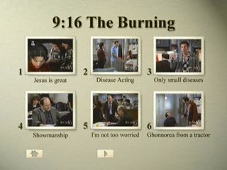 Jerry's gal answers the phone by saying "it's me", which is totally uncalled for as she is not a "me" like George or Elaine. At the behest of George, Jerry does it to her and she thinks it's a friend of hers, and says that she never told Jerry the tractor story, which remains a mystery until the very end of the episode. George leaves his job on a high note every time, which makes his boss, Kruger, become incredibly ADD and entrusts the company to George basically. Elaine finds out that Puddy is a Jesus freak, that she is going to hell, and then they both find out that they are both going to hell for "having a good time". Finally, Kramer and Mickey act out diseases for medical students to much critical acclaim.