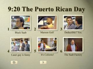 SUMMARY Because of the Puerto Rican Day Parade, Jerry, Elaine, Kramer, and George get stuck in traffic on the way home from a Mets game. Elaine is desperate to make it home in time to watch 60 Minutes, her weekend wind-down program. Jerry and another driver get into a feud. George tries to make a movie audience laugh but is upstaged, and stalked, by a laser pointer. Kramer infuriates the Puerto Rican community when he accidentally sets their flag on fire.