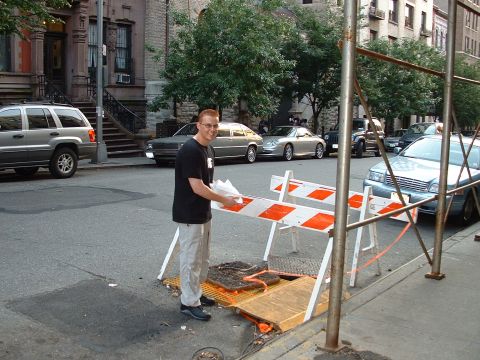 Even though we had already had Adam jumping over the pothole from 8:16 The Pothole, we wanted to take a pic with the pothole being worked on by construction workers, but at this time, we just had a pothole that was being worked on without construction workers, (but later that night, unbeknownst to us, we would find construction workers working on a pothole, albeit a different one, not on 86th Street) from the same ep, so even though it was on the wrong street, it was a pothole being worked on.